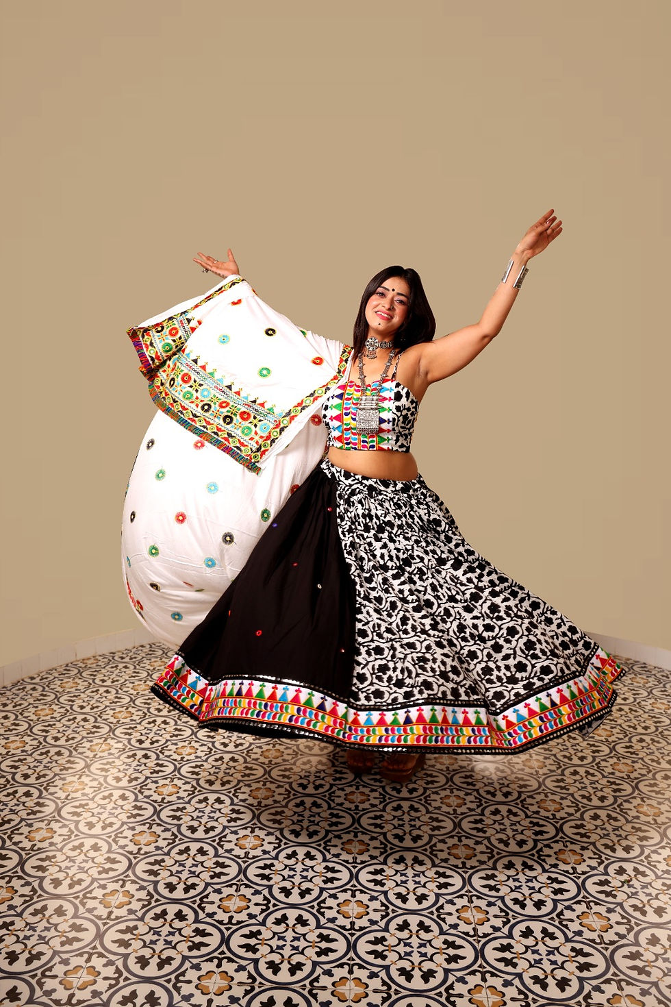 Black and white floral printed chaniya choli with 2 blouses
